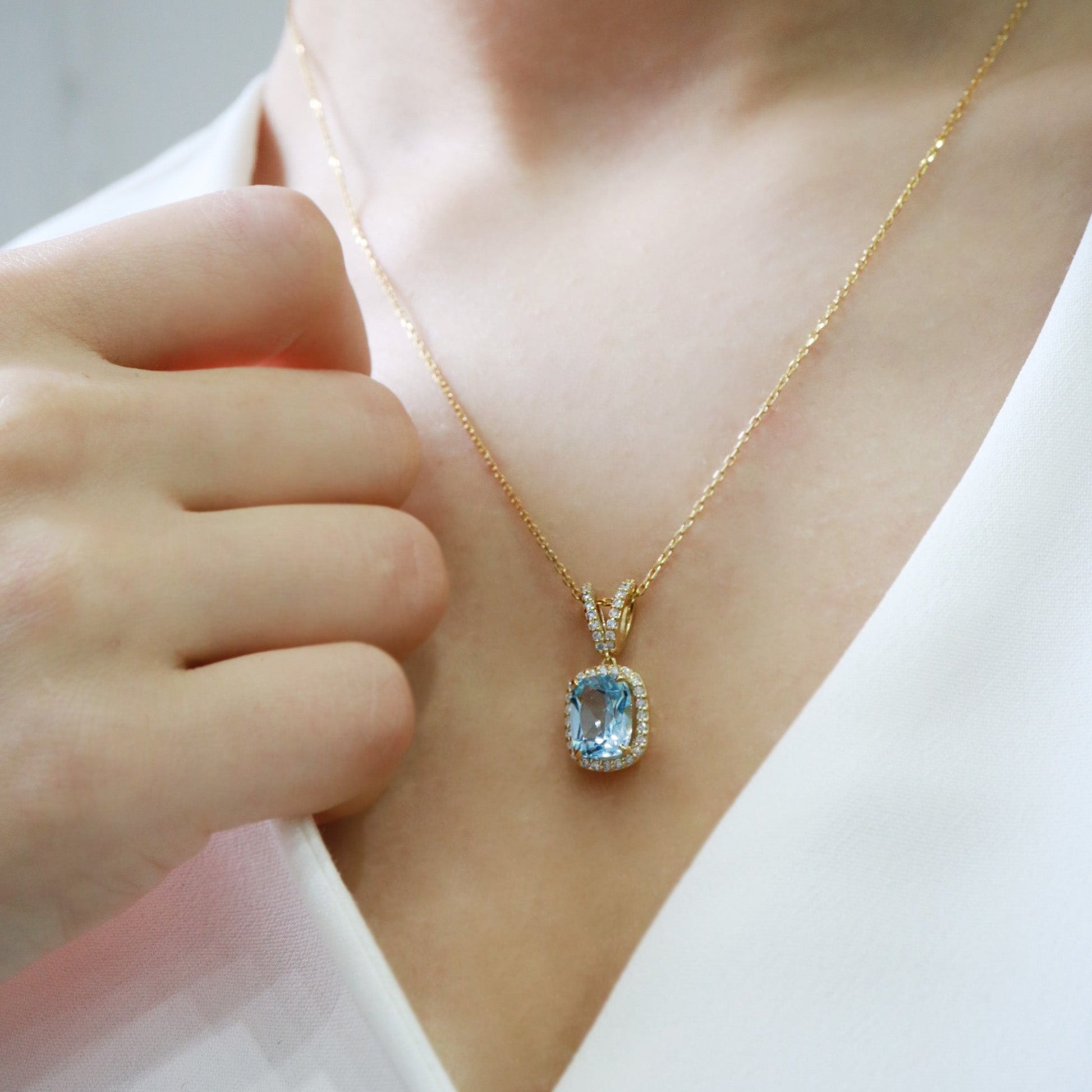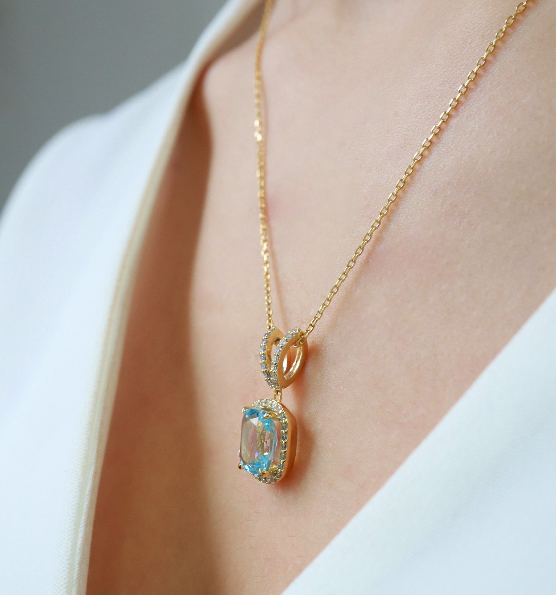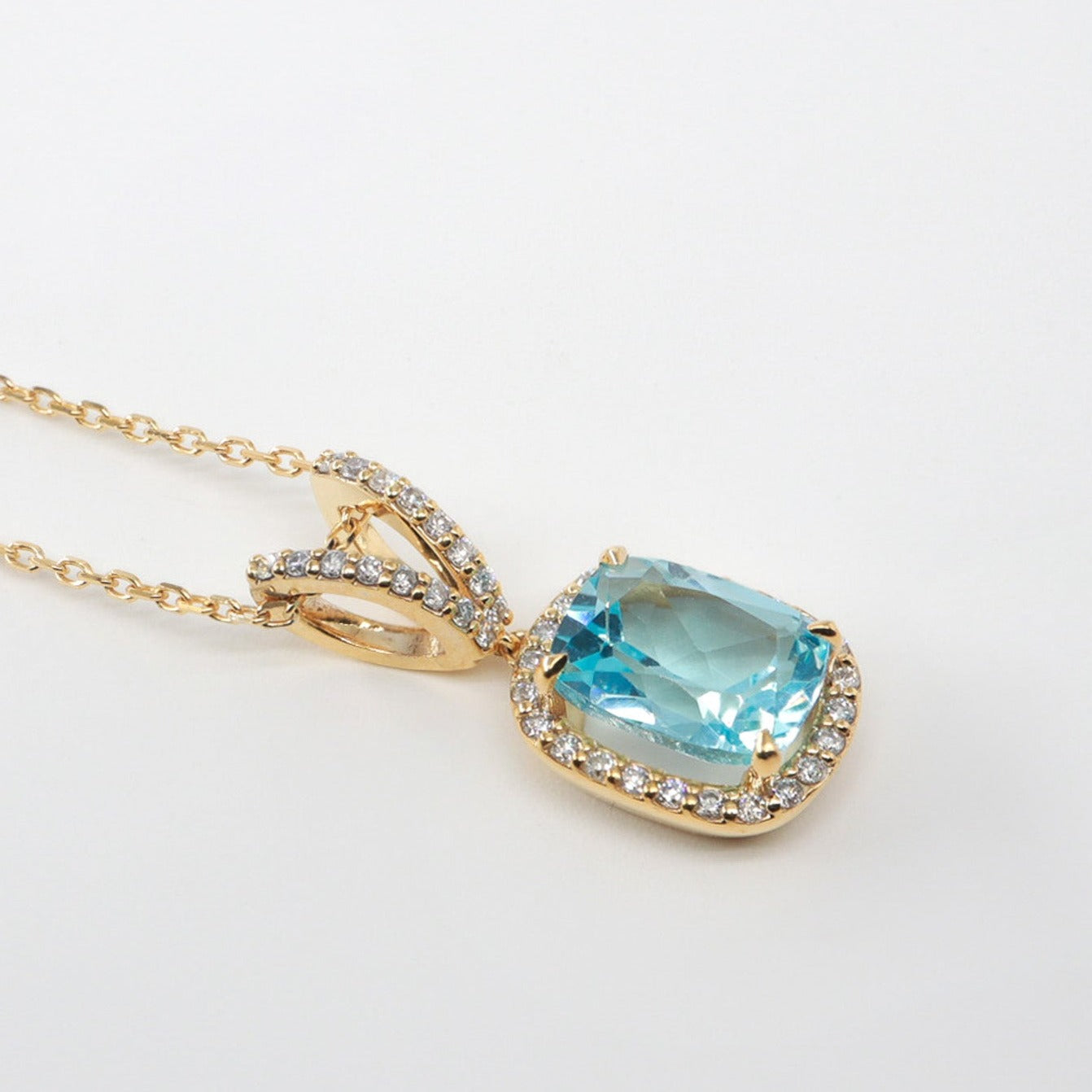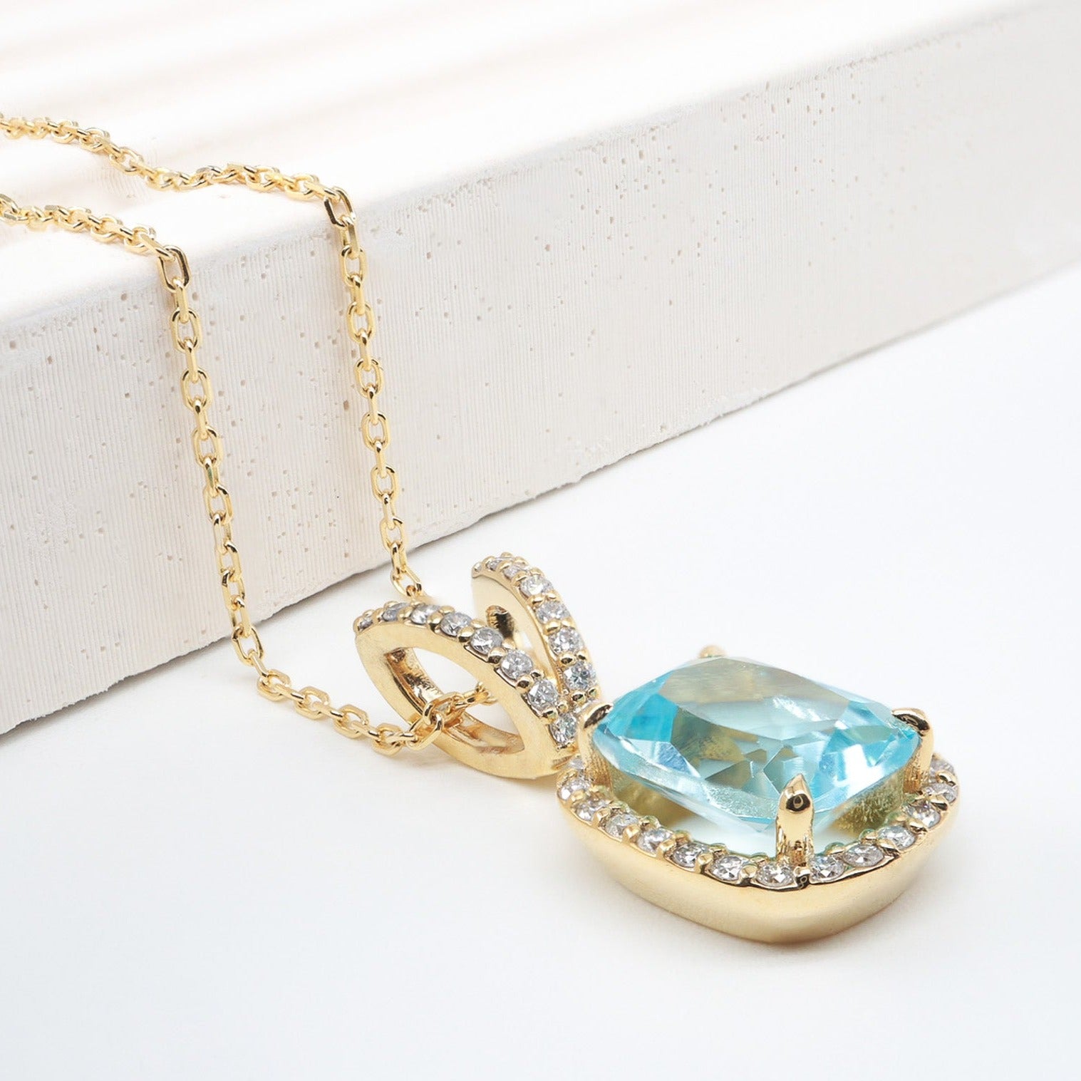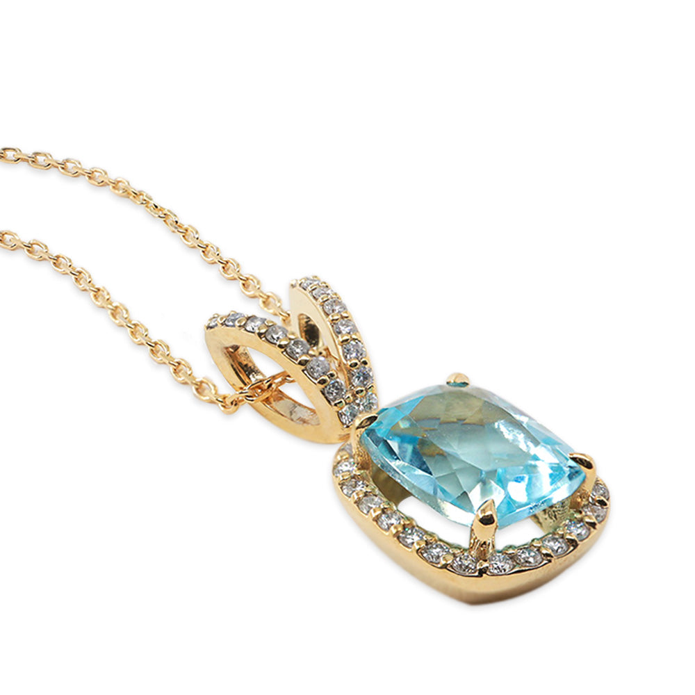 Cushion Kesim Mavi Topaz & Pırlanta Kolye